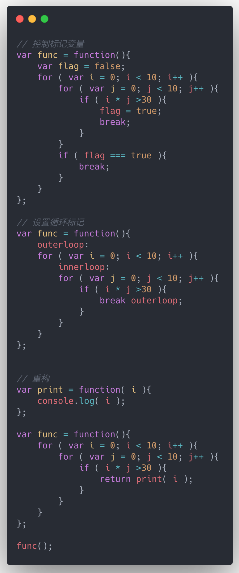 假设在函数体内有一个两重循环语句,使用控制标记变量或者设置循环标记这两种做法无疑都让人头晕目眩。 用return直接退出方法会带来一个问题,将来不能执行循环之后的代码,可以return函数。
