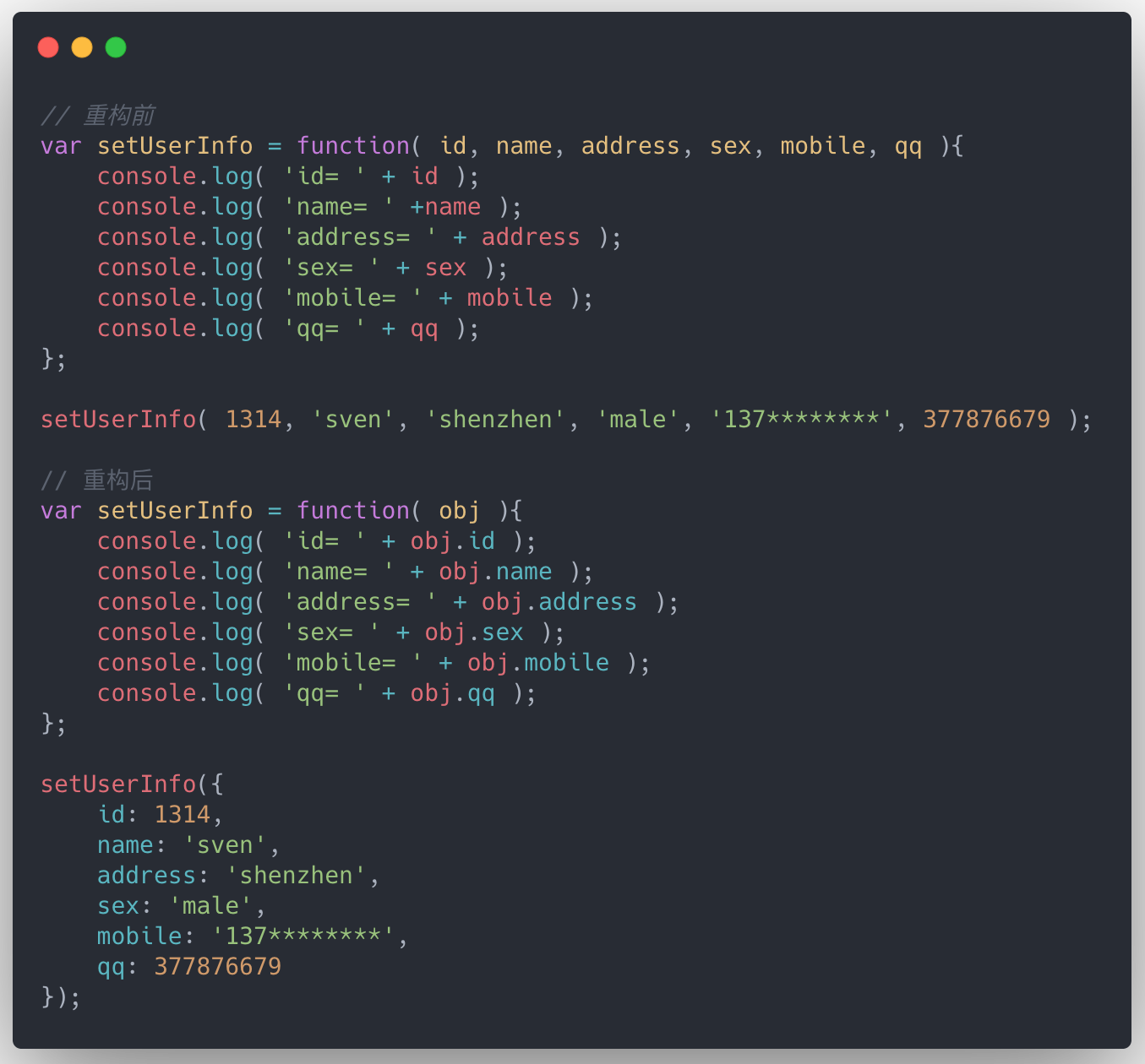 一个函数接收的参数数量越多,函数就越难理解和使用。在使用的时候,还要防止少传了某个参数或者把两个参数搞反了位置。 使用对象就可以不用再关心参数的数量和顺序,只要保证参数对应的key值不变就可以了。