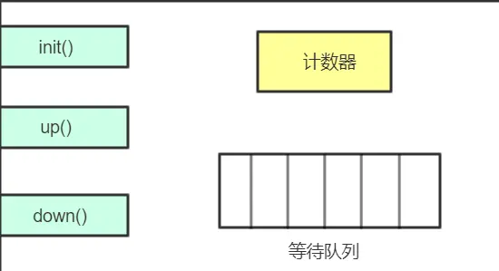 信号量模型可以简单理解为三个操作:一个计数器、一个等待队列、三个方法。在信号量模型里。计数器和等待队列对外是透明的,所以只能通过信号量模型提供的三个方法来访问他们。这三个方法可以理解为: init()、down()、up()。 可以通过一张图片看一下。