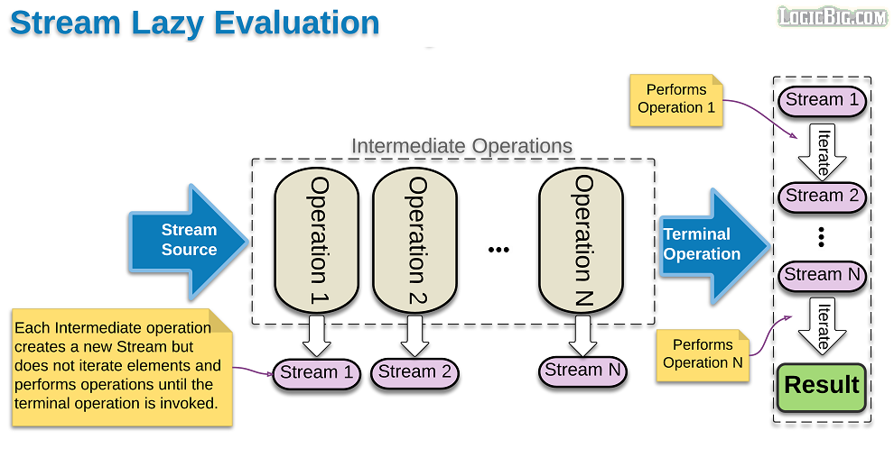 通过Collection接口的stream()方法,返回一个流对象(ReferencePipeline.Head),后续每调用一个中间操作都会生成一个流对象(StatelessOp/StatefulOp),并与之前的流对象(管道/stage)连接形成一个整体的管道,最后调用终止操作(TerminalOp),会触发真正的操作,将源数据流经管道,由管道中的各个操作Op处理,最后返回给调用方。