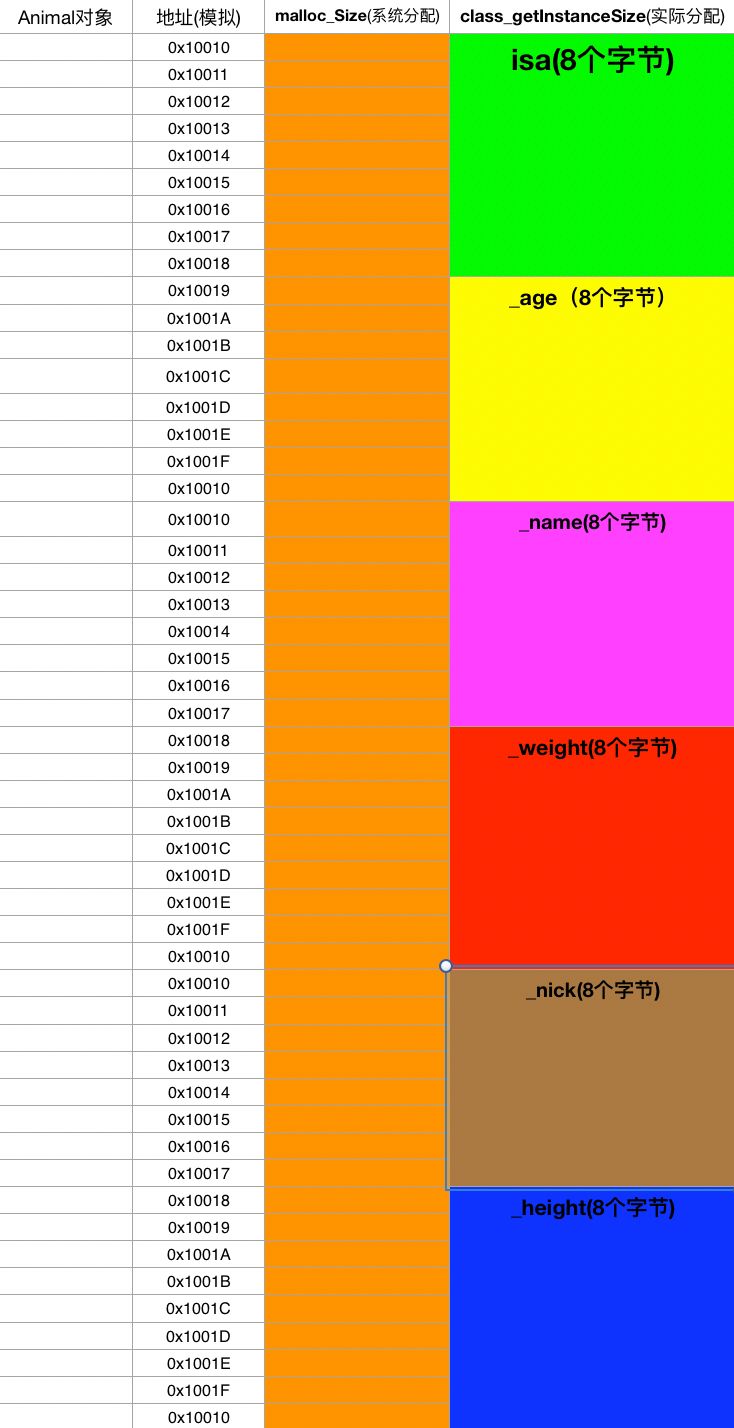 1struct NSObject_IMPL {2 Class isa;3};45struct Animal_IMPL {6 struct NSObject_IMPL NSObject_IVARS; //指针对象,占用一个机器字长,占用8个字节7 int _age; // 4个字节8};