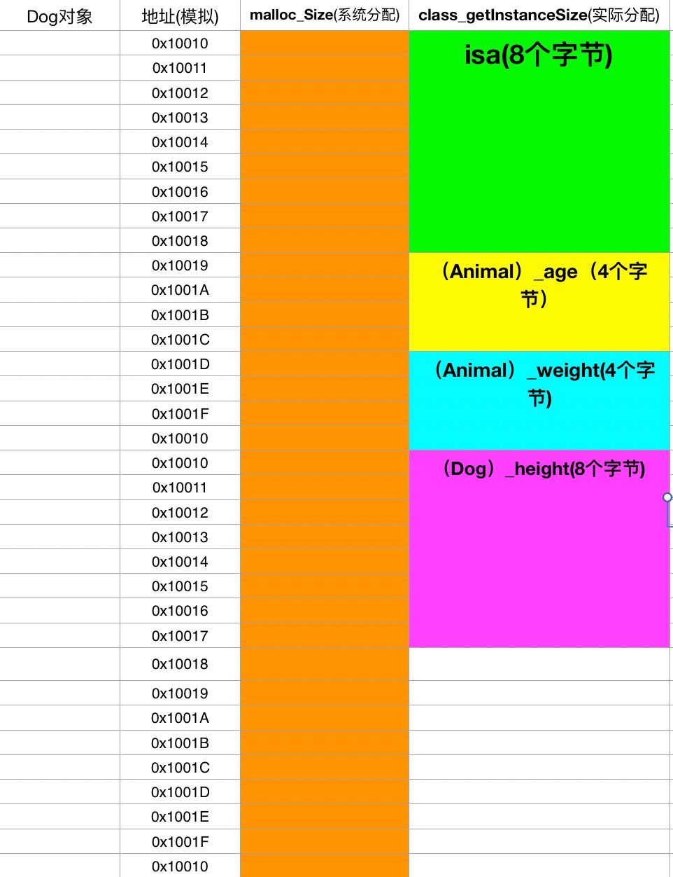 1@interface Animal : NSObject { 2 @public 3 int _age; 4 int _weight; 5} 6@end 7 8@implementation Animal 9@end1011@interface Dog : Animal {12 @public13 int _height;14}15@end1617@implementation Dog18@end