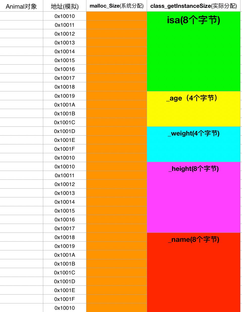 1Animal -- class_getInstanceSize = 322Animal -- malloc_size = 323Animal -- sizeOf = 8