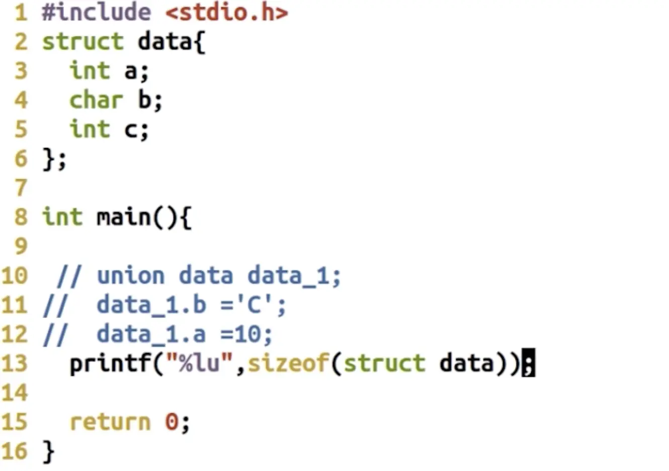 然后到了这里还没结束,编译器还要去判断。现在的结构体总大小是不是结构体中最宽的基本类型成员大小的整数倍,在我们这个里边的最宽的基本类型就是int,是四字节,是能够被12整除的,所以这里是没有问题,那么如果这个最宽的基本类型不能够被我们当前的这个偏移量加上最后一个类型大小的和整除的话,那就还要在c的后边去做一个字节填充。那这样的我们得到的结果就是这个struct类型的真实的大小。