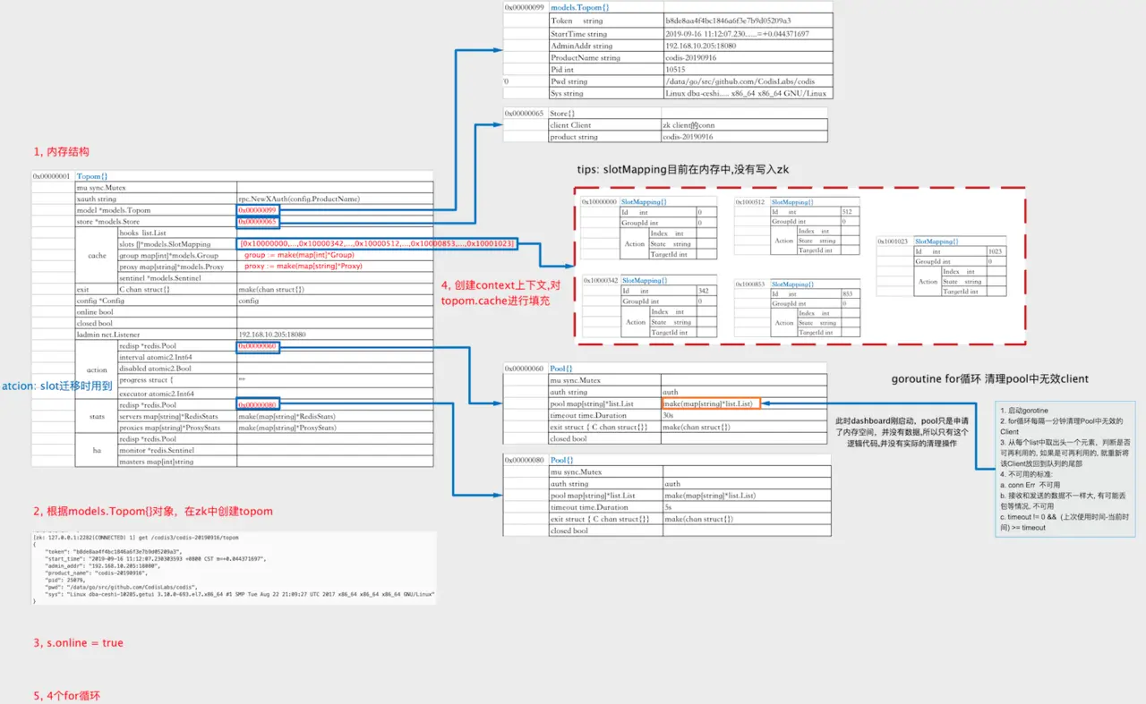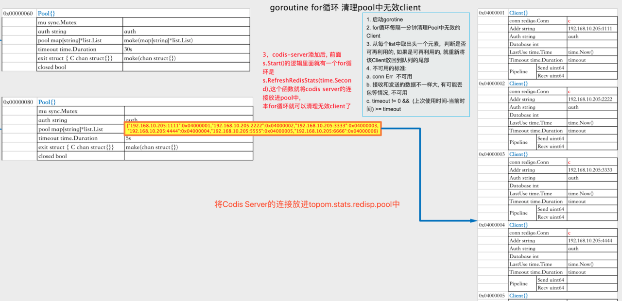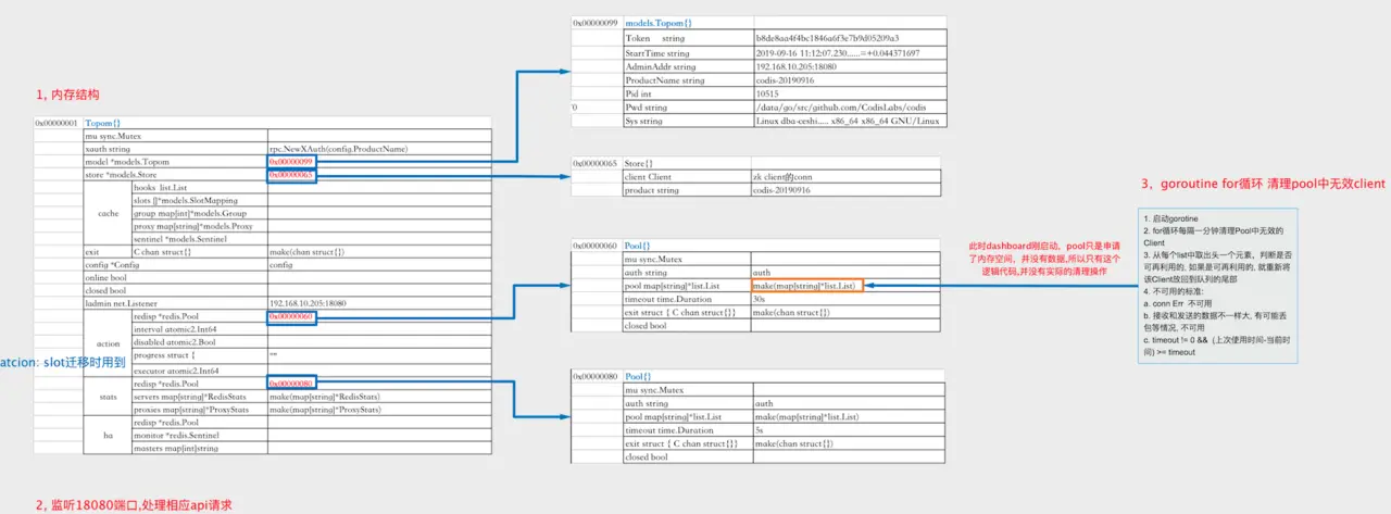 tips ⭕ Topom{}在Start时,有4个goroutine for循环,其中RefreshRedisStats执行过程中会将codis server的连接放进topom.stats.redisp.pool中;