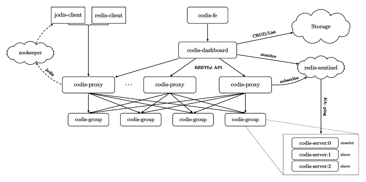 Codis分为四个部分,分别是: Codis Proxy (codis-proxy) Codis Dashboard Codis Redis (codis-server) ZooKeeper/Etcd