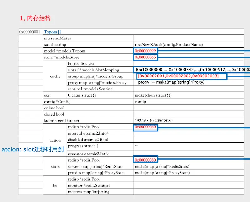 如何保证slots在迁移过程中不影响客户端的业务? ⭕ client端把命令发送到proxy, proxy会算出key对应哪个slot,比如30,然后去proxy的router里拿到Slot{},内含backend.bc和migrate.bc。如果migrate.bc有值,说明slot目前在做迁移操作,系统会取出migrate.bc.conn(后端codis-server连接),并在codis server上强制将这个key迁移到目标group,随后取出backend.bc.conn,访问对应的后端codis server,并进行相应操作。