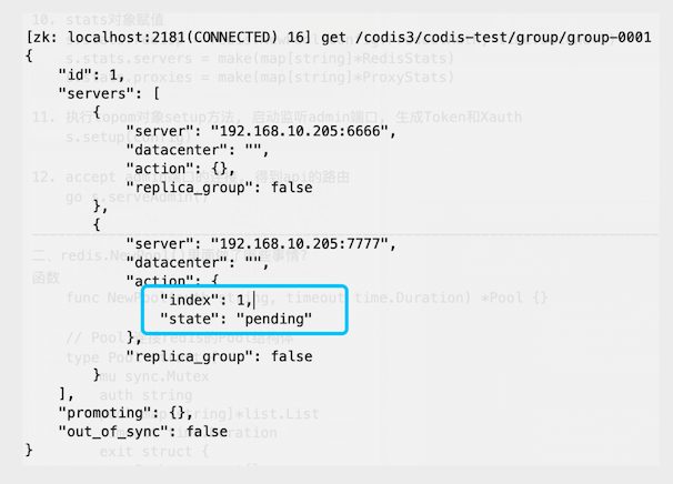 ⭕ 判断通过后,获取所有codis server状态为ActionPending的最大的action.index的值+1,赋值给当前的codis server,然后设置当前作为slave角色的节点的状态为:g.Servers[index].Action.State = models.ActionPending。将这些信息写进zk。
