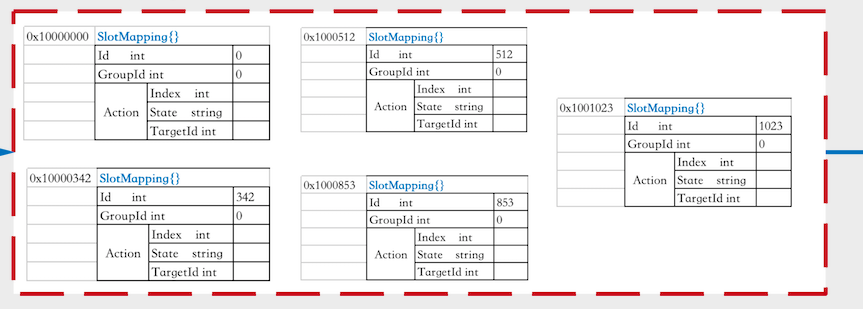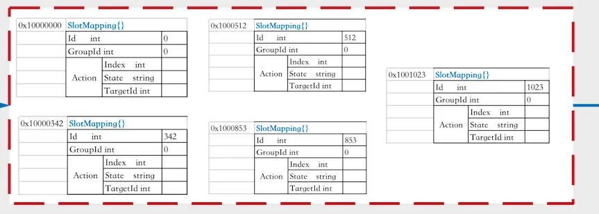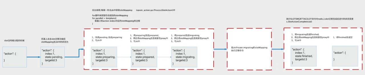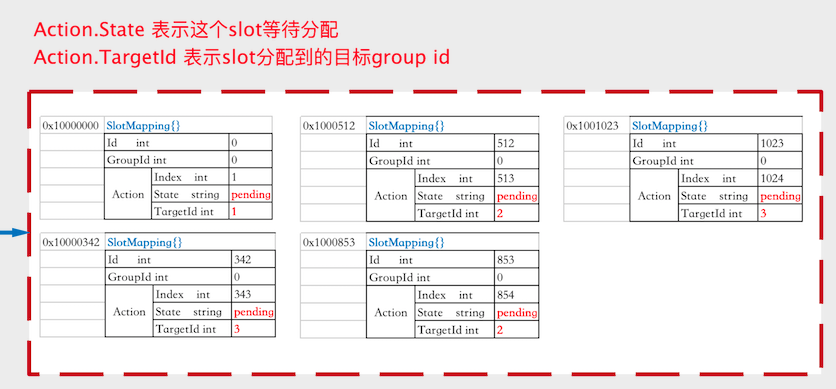 通过Topom.store我们首先从zk中重新获取最新的slotMapping、group、proxy等数据填充到topom.cache中,再根据cache中最新的slotMapping和group信息,生成slots分配计划 plans = {0:1, 1:1, … , 342:3, …, 512:2, …, 853:2, …, 1023:3},其中key 为 slot id, value 为 group id。接着,我们按照slots分配计划,更新slotMapping信息:Action.State = ActionPending和Action.TargetId = slot分配到的目标group id,并将更新的信息写回zk中。