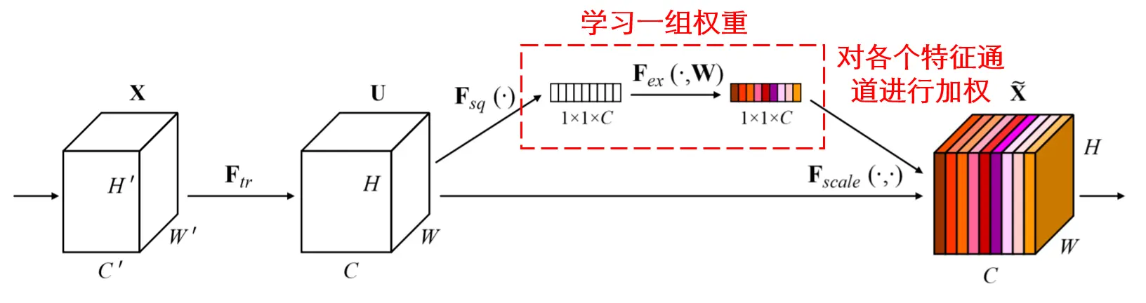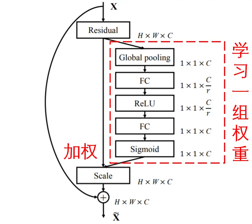 在这里,每一个样本,都有着自己独立的一组权重。任意的两个样本,它们的权重,都不一样。在SENet中,获得权重的具体路径是,“全局池化→全连接层→ReLU函数→全连接层→Sigmoid函数”。