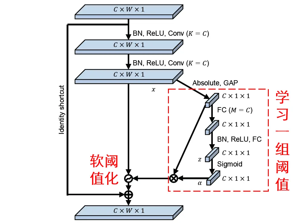 通过红色框内的子网络,可以获得一组阈值。这组阈值可以被应用在各个特征通道上。