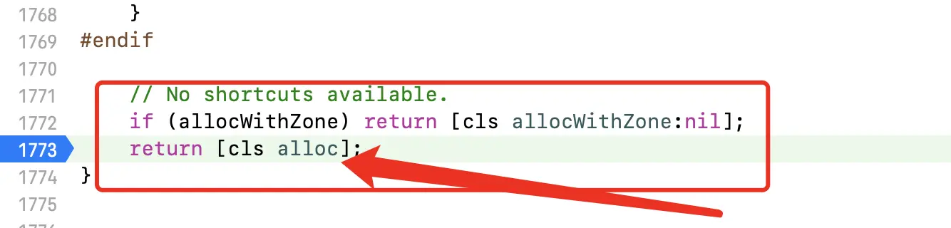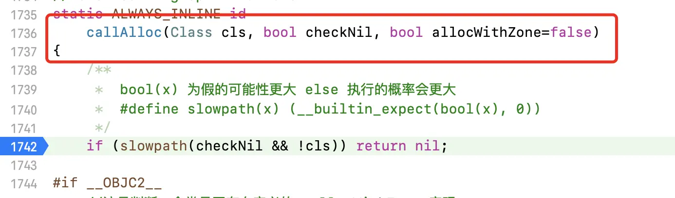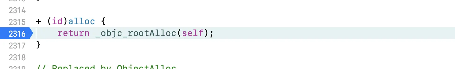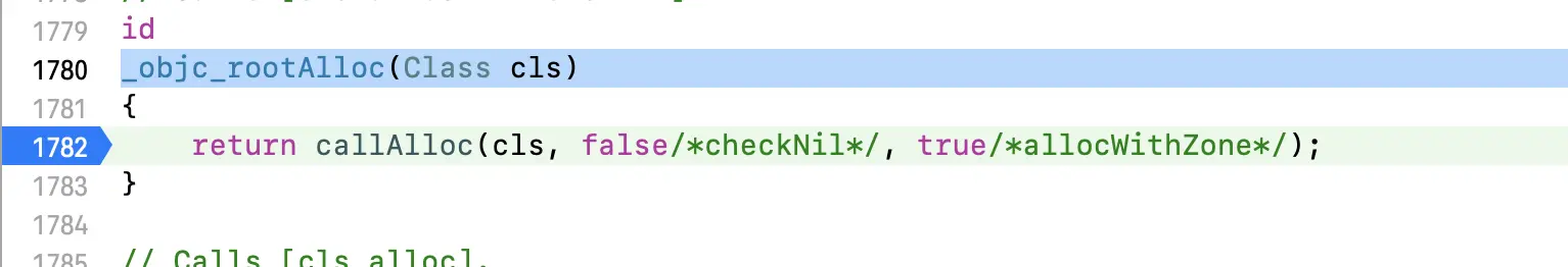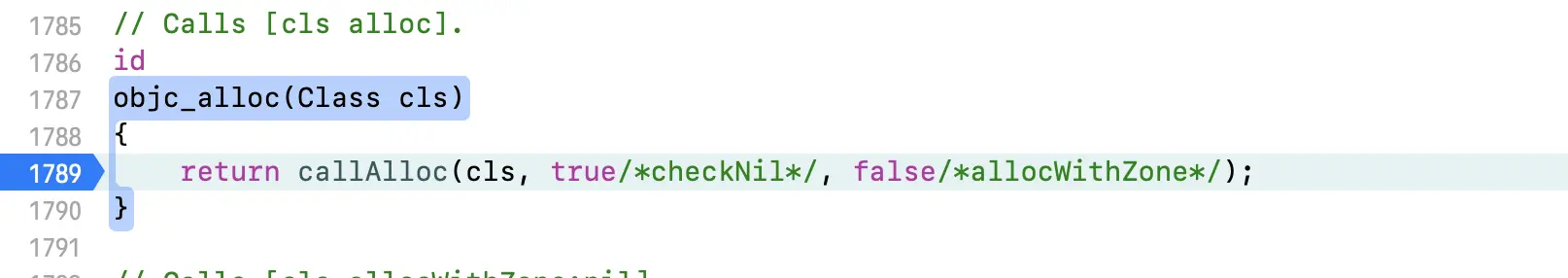 从上方的截图就能看到,先调用的是 objc_alloc ,然后调用 callAlloc 函数的 [cls alloc] ,然后才来到我们点击 alloc 直接跳转的方法里面来,接下来就是 alloc初探 的流程了。
