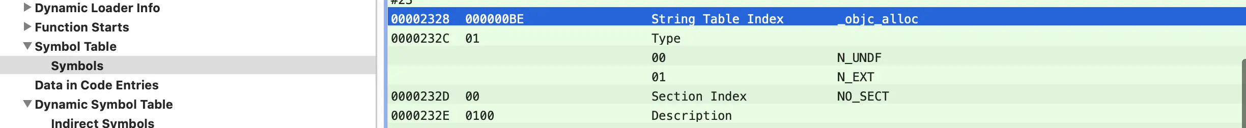 打开 objc-debug.MachO 文件,在如下 symbol Table 段就能看到 objc_alloc 的符号绑定。