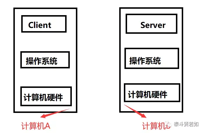 你要是没听过这两个词,就先暂时把它们想象成是两个软件,我们假如想要开发这两个软件,让它们基于网络通信。那这个客户端软件和服务器端软件肯定不是操作系统吧,你要明白,我们学习Java、Python是为了成为应用开发程序员,而不是开发操作系统的,我们只需要用别人开发好的操作系统。那我们确定客户端软件和服务器端软件一定是应用软件,它们要想执行,过程跟上面图片中所讲的一样吧。如下图: