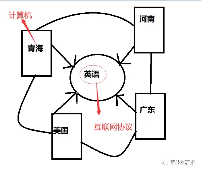 再切换过来,我上面说把我和我的电话看成是一台计算机,那上面的情景就相当于是计算机和计算机之间进行通信,那计算机和计算机进行通信所遵循的协议就是互联网协议。什么是协议?就跟合同一样,大家都按上面的去做,换句话说,互联网协议就是计算机界的英语,这没毛病吧。看下图: