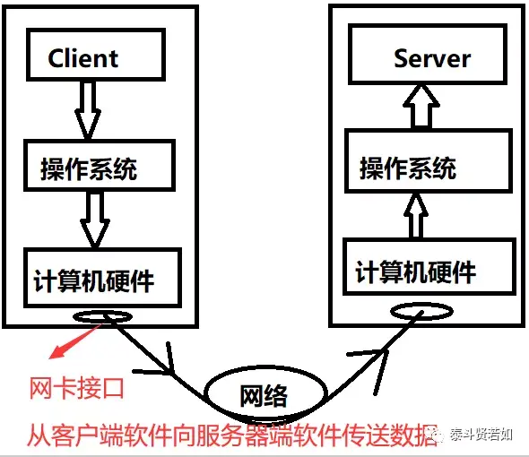 看见这张图你应该清晰了,然后我们说要基于网络让两台计算机进行通信,那这两台计算机之间应该有一根网线连接才能通信吧,然后客户端软件想把硬盘中的信息发送给服务器端软件,就需要先通过操作系统控制硬盘,然后通过网线传输给服务器端,服务器端要想给客户端发送消息亦是同理。
