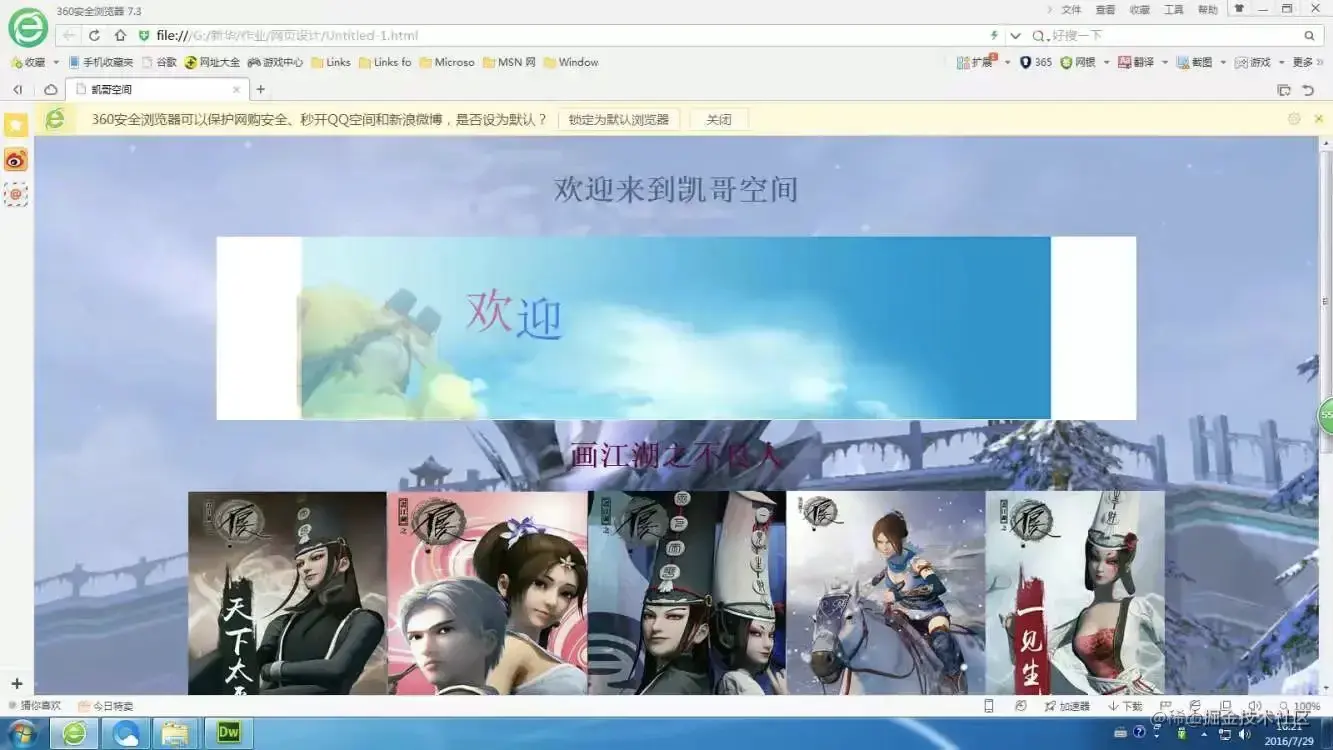 2016年7月16号,来学校了解情况,被接待老师一番忽悠,最让我信服的一段内容是:第一年教C语言,第二年教Java,第三年学校安排我们去大公司实习,最终交了学费,第二天开始正式上课,老师教我们做一个网页,心想:这学校还不错,一进来就教代码。学了将近半个月时间,用DW画了一个简单的网页出来,当时成就感满满。