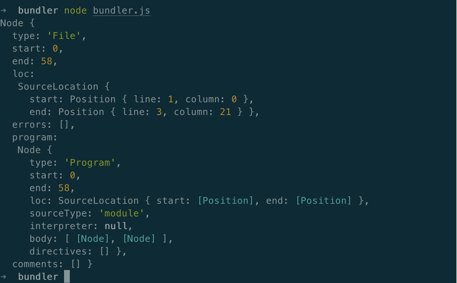 再次执行node命令,node bundler.js,查看文件内容,输出的就是常说的AST,描述了文件的相关依赖关系。