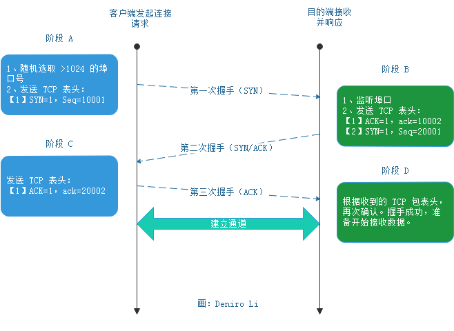 TCP 包在建立连线之前,都必须要通过三个确认动作,所以这种连线方式也就被称为三次握手 (Three-wayhandshake)。 整个流程可以以 A , B , C , D 四个阶段来说明: