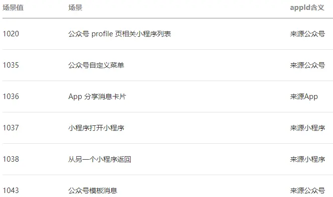 部分场景值下还可以获取来源应用、公众号或小程序的appId