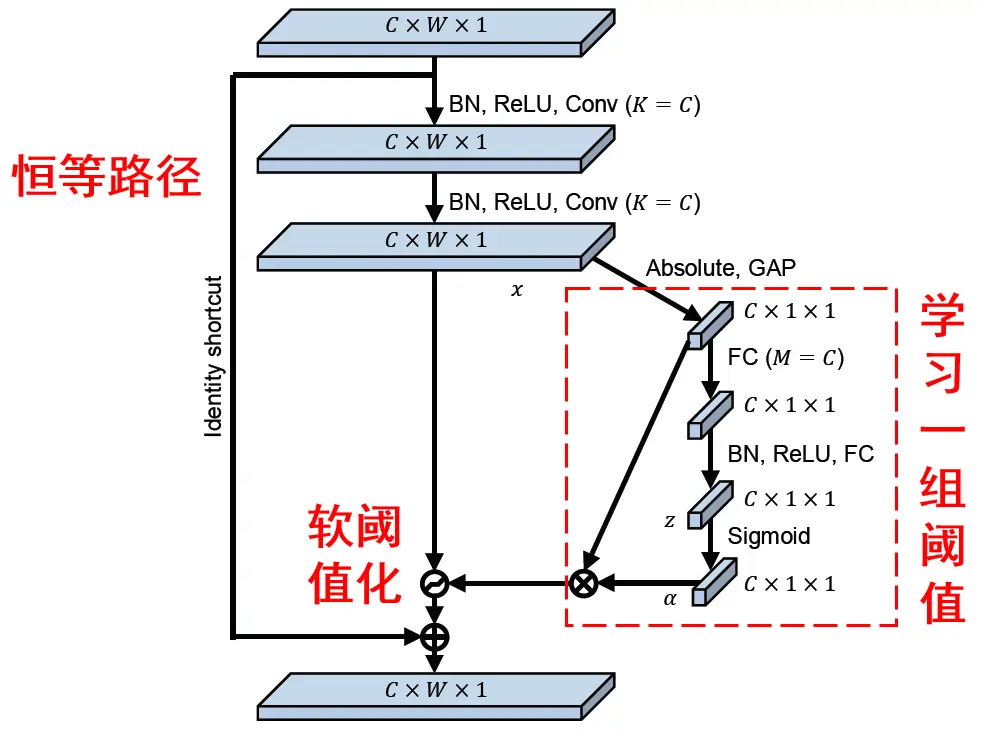 最重要的,深度残差收缩网络中的残差模块,将SENet中的“加权”替换成了“软阈值化”: