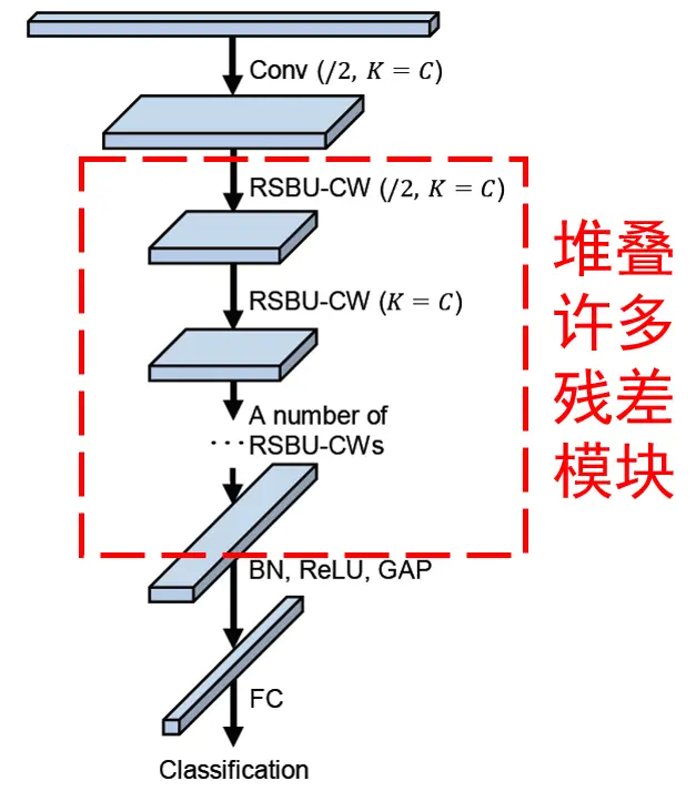 最后,深度残差收缩网络的整体网络结构如下图所示: