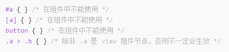 - 组件和引用组件的页面不能使用id选择器(#a)、属性选择器([a])和标签名选择器,请改用class选择器