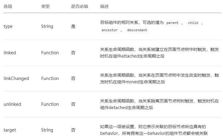 relations 定义段包含目标组件路径及其对应选项,可包含的选项见下表