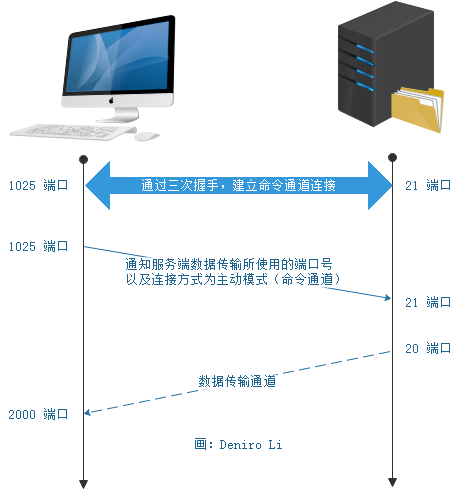 (1)建立命令通道 用户端会随机取一个大于 1024 以上的端口 (比如示例中的 1025 ) 来与 FTP 伺服器端的 21 端口达成连线,这个过程需要三次握手!达成连线后用户端便可以透过这个命令通道对 FTP 服务器下达指令,比如查询 、 下载 、 上传等指令都是通过这个通道来下达的。