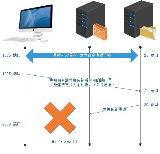 当用户端需要数据时,会先随机启用一个端口 (比如示例中的 2000) ,然后使用刚才所建立的通道,来通知服务端数据传输所使用的端口号以及连接方式为主动模式,之后等待 FTP 服务器的连线。