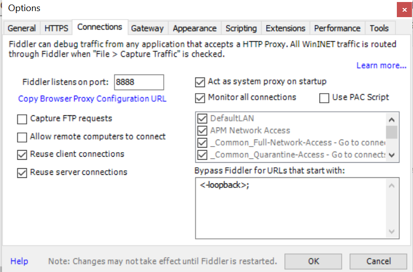 打开Fiddler,在connections面板里找到Fiddler监听的端口号8888: