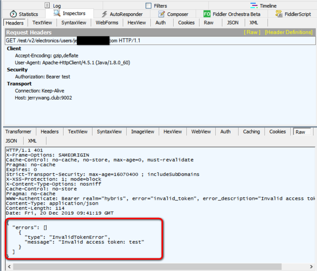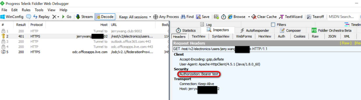 执行Java应用,然后到Fiddler里,看到了监控到的HTTP请求各种明细,比如Java代码里硬编码的OAuth 2的认证token test:
