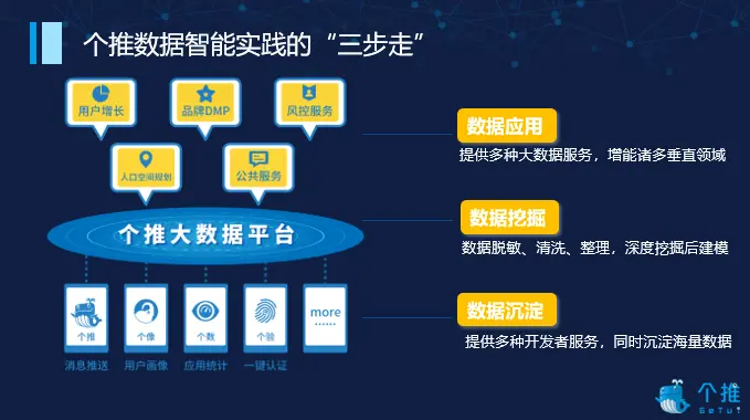 2019年3月,个推(每日互动,300766.SZ)在创业板上市,主打数据智能。公司在该领域积极布局,并在实践中探索总结了数据沉淀、数据挖掘和数据应用的“三步走”数据智能方法论。关于底层,个推提供了消息推送、用户画像、应用统计、一键认证四种开发者服务,同时沉淀了海量数据;中间层是个推引擎层,通过对数据脱敏、筛选、清洗、整理,并经深度挖掘后建模,自主构建“个推大数据平台”。最上层为数据应用层,提供品牌营销、风控服务、人口空间规划、公共服务等多种大数据服务,增能诸多垂直领域。