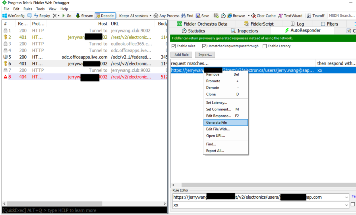 在Fiddler session监控列表里,找到要生成mock响应的请求,进入AutoResponder标签页,将Enable rules前面的勾选中,创建一条新的rule,点击Generate File: