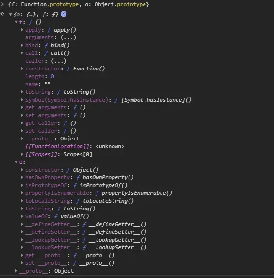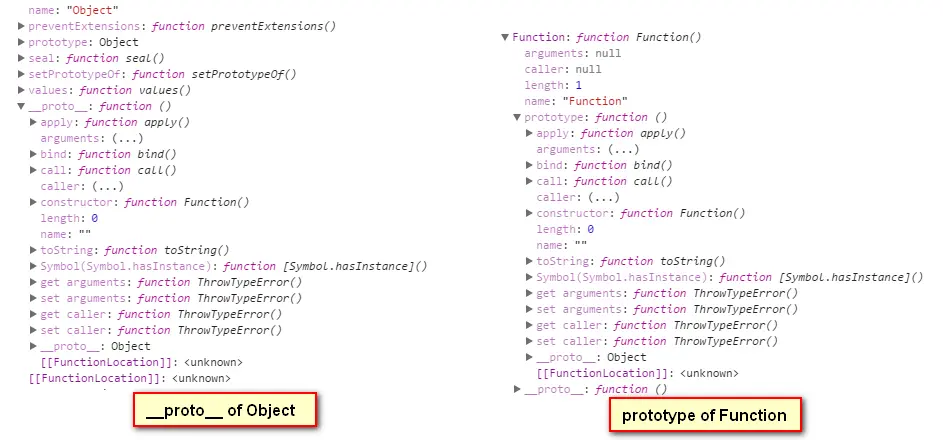 Object, Function, Object.prototype 和 Function.prototype 也有一些函数属性。如 Object.assign、Object.prototype.hasOwnProperty、Function.prototype.call,这些都是引擎内部函数,他们没有 prototype 属性,它们是 Function 的实例,它们有指向 Function.prototype 的 __proto__ 属性。