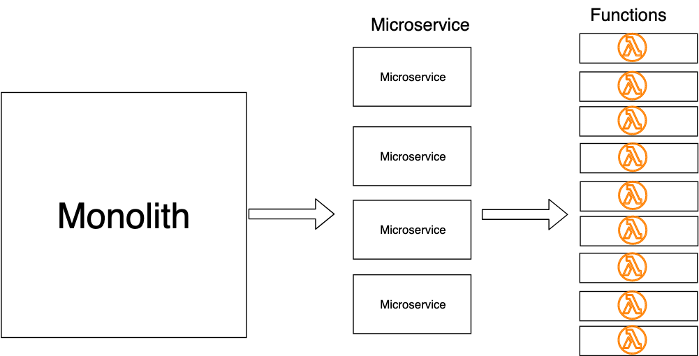 下图,将 Microservices 进一步细分为 Function as a Service(FaaS)函数即服务,相比微服务颗粒度更小。