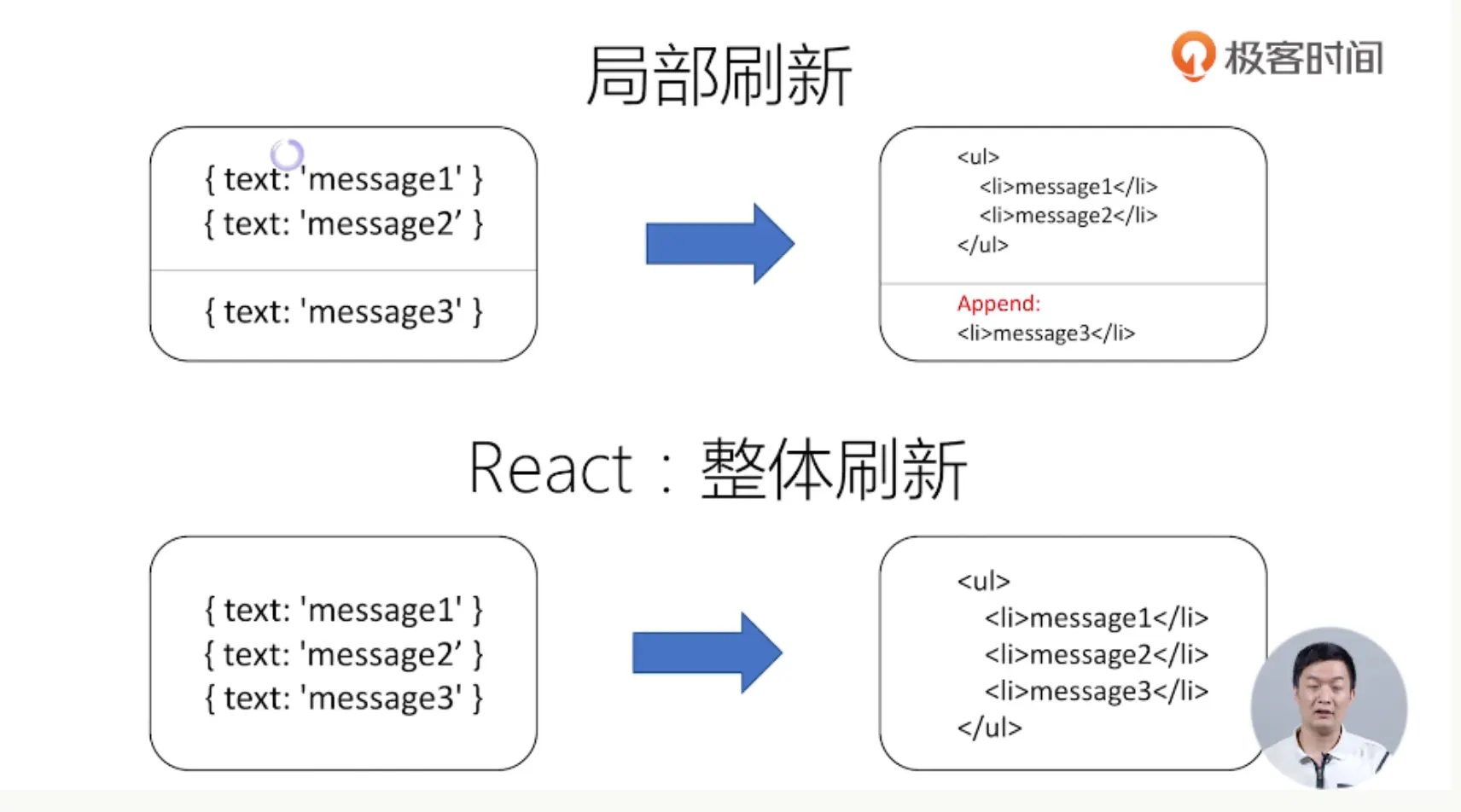 为此 React 提出了一个新的思想,即始终整体“刷新”页面