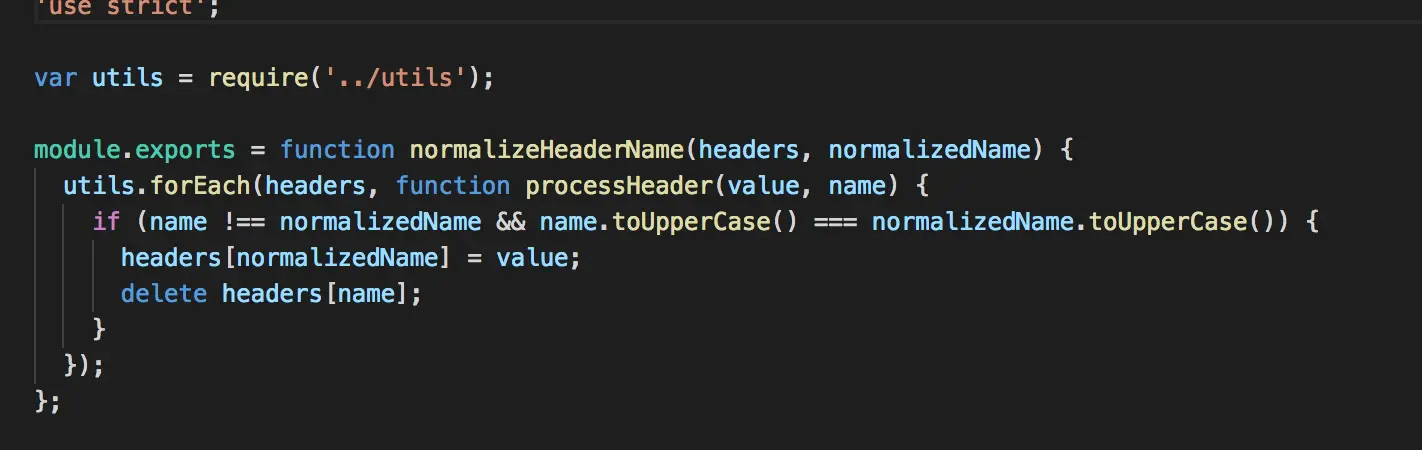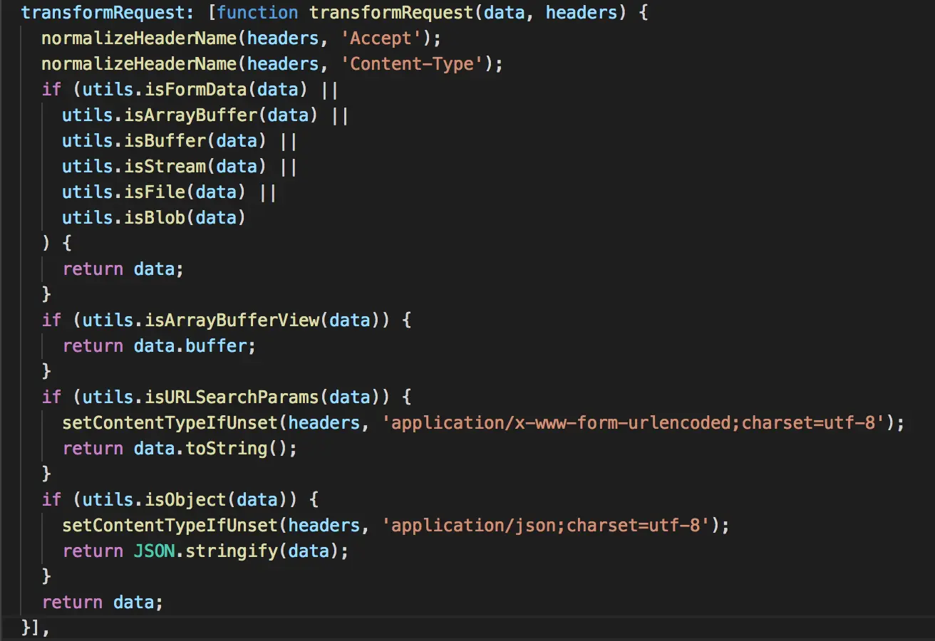 注意这个属性是一个数组,包含一个函数作为数组元素,这个函数有两个参数,一个是请求数据data,一个是请求头信息,可以看出,这个函数首先调用normalizeHeaderName这个helper目录下的辅助方法,对请求头信息的字段名称做规范化处理,保持请求头字段名称一致,方便后续处理
