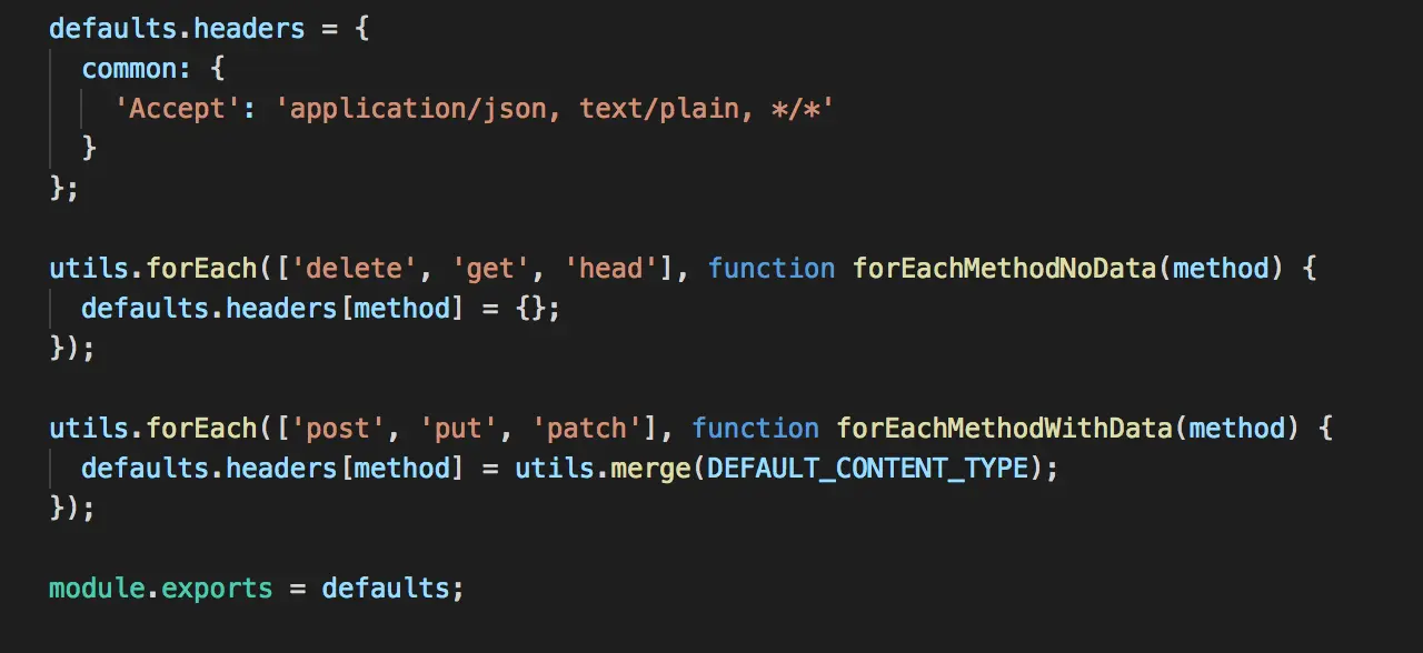 首先为defaults设置默认的headers,然后给defaults的headers设置delete,get,head三个属性,默认都为空对象,又继续为defaults的headers设置post,put,patch三个属性,属性值是包含一个默认Content-Type的值的对象,这个merge方法就是把传入的对象对象属性合并到一个空对象上,看到这个6个属性,是不是很熟悉呢?