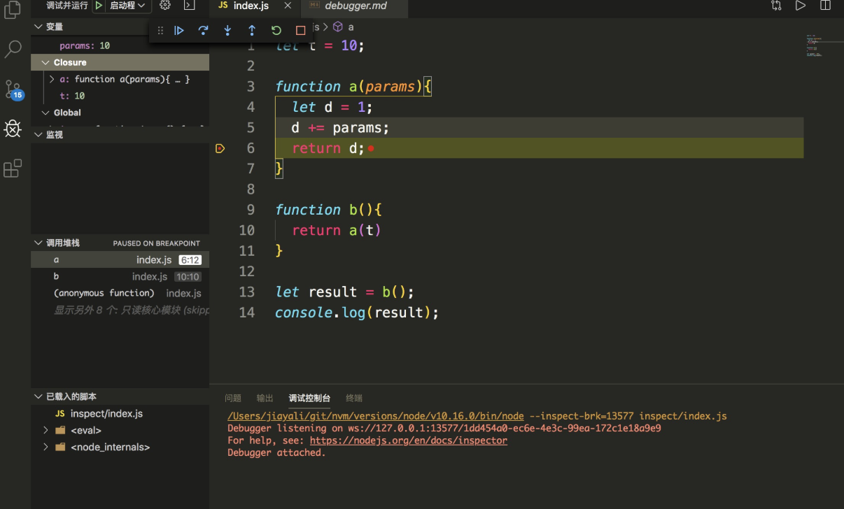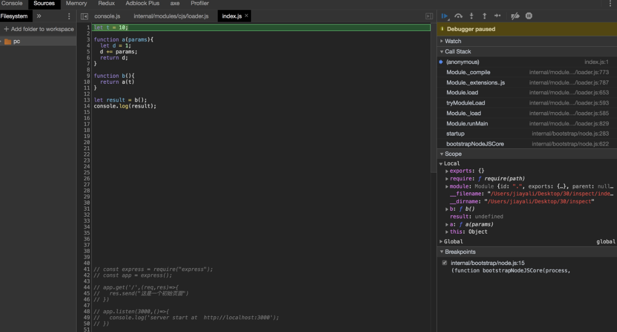 了解了基本的概念之后接下来我们实践一把 新建一个inspect 目录,然后新建 index.js。详细介绍nodejs 的调试客户端:
