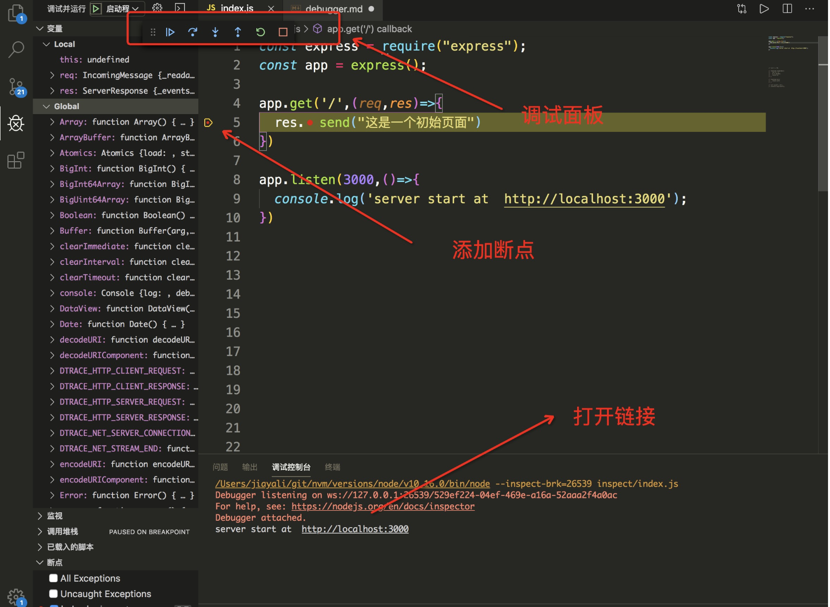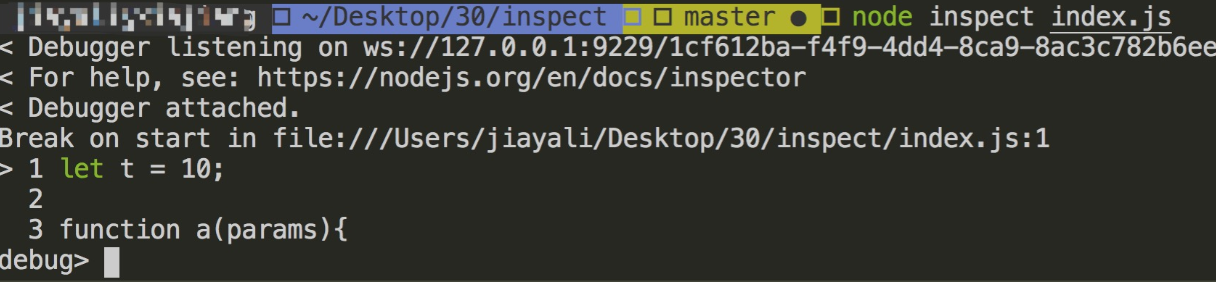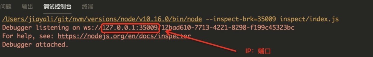 首先当我们启动 inspector 的时候首先会开启一个websockets服务,用来监听命令 比如:断点在哪里,下一步,上一步,等等这些命令。之后通过inspector协议 进行客户端和服务端的协同调试工作,同时还会 启动一个单向的http服务,这个服务用来获取元信息。 了解基本的概念之后我们来实际场景中看下。 以图二为例,可以看到在开启调试模式之后vscode 的调试控制台输出如下: