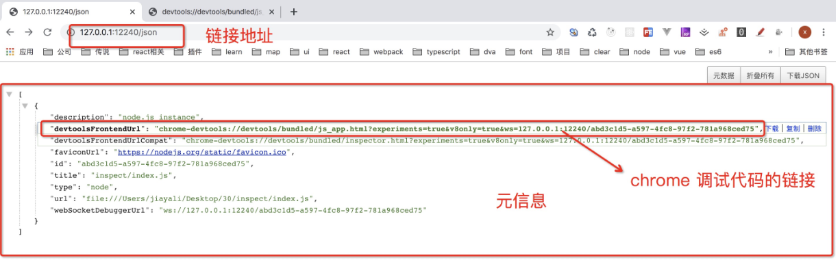 复制相应 ip:端口 到命令行即可看到websocket 已经打开了,加上/json 即可看到它的元信息 如下所示: