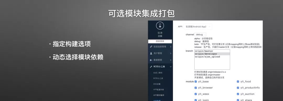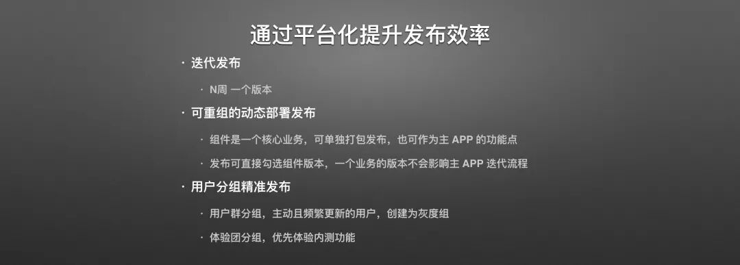 在之后就是我前面提过的,工厂化发布一个APP。我们可以根据业务需要任意组装业务模块,最后拼成一个APP,快速发布到线上,查看这个应用的数据反馈,如果这个应用从数据层面看运行的非常好,那么就可以考虑引导流量到这个应用。 如果数据不好,那么尽早放弃降低研发成本,准备其他的业务也更灵活。