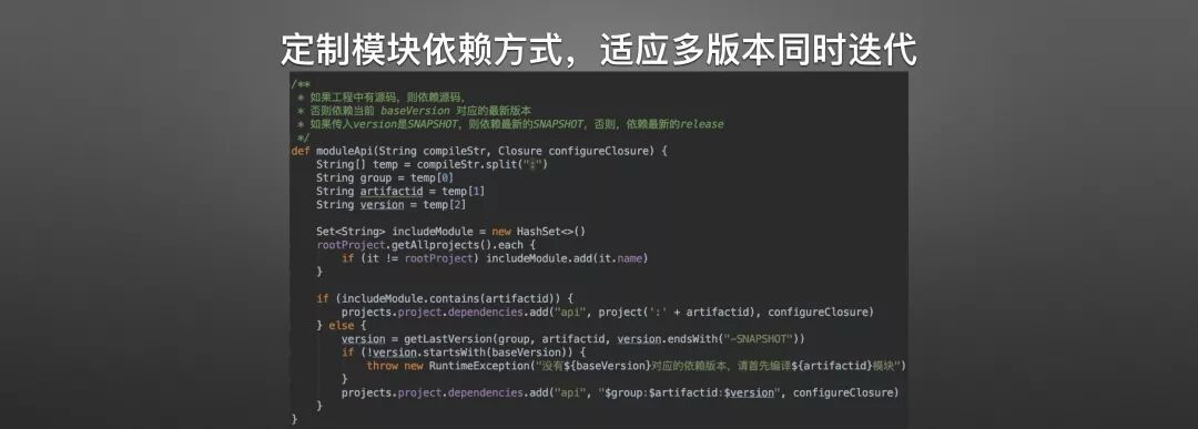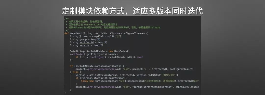 这就是前面 moduleApi 的实现,其实就是判断了一下baseVersion 是否一致,如果一致,那么就直接引用最新版本,如果不一致,则抛异常退出编译。从而将运行时的错误在编译期就直接发现。
