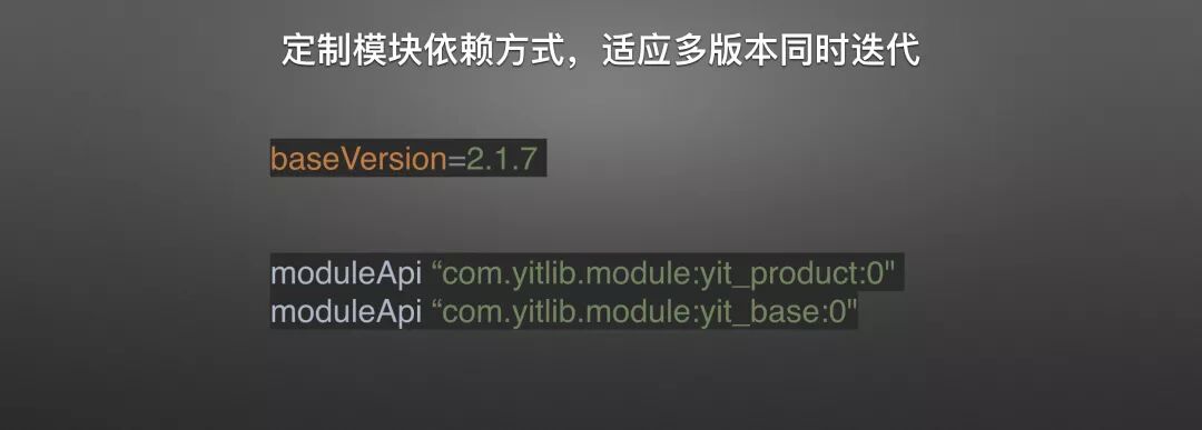那么除了这个问题,还有就是多版本协作开发时候的模块依赖问题。 Android 使用的是 Gradle 构建,如果出现基础接口更新,上层所有依赖都跟着重新更改一下,再做一次兼容。 这种事本来是无可避免的,但是如果我们有多个版本同时开发,这个问题就大大提升了版本管理的复杂度问题。所以我们引入了一个 baseVersion 的概念,也就是你当前模块构建的目标版本号。只要依赖的模块的目标版本号一致,就可以不用考虑兼容性问题直接更新,如果baseVersion 不一致,那说明这是一次不兼容升级,需要上层模块处理完兼容性问题后再发布。