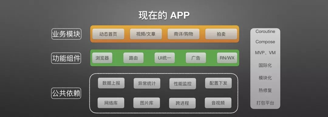 侧边是一个贯穿我们整个应用的综合性技术,像 Kotlin 的 Coroutine(协程)、Google 新推出的类似 SwiftUI 的 Jetpack Compose、模块化、国际化、插件化等等,都是改动一块,整个应用可能都会发生变动的技术点。我们如今的应用已经到了如此惊人的一个庞大体量,但是……