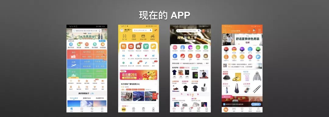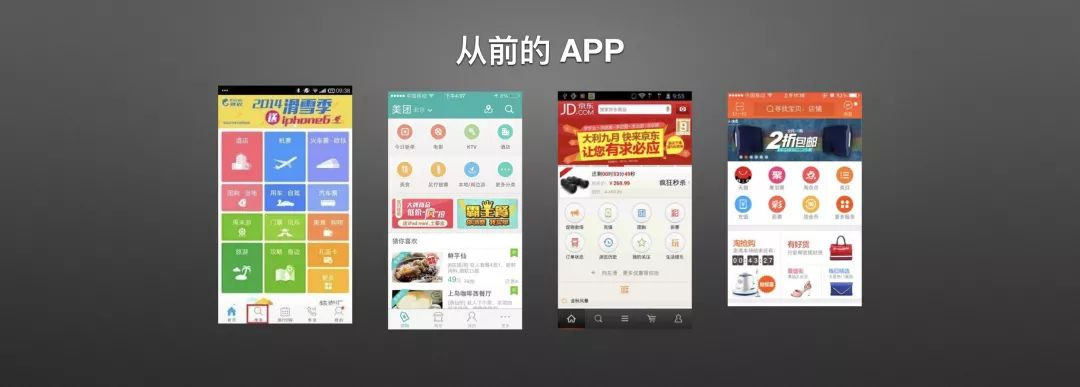 这是我们曾经的 APP,携程、美团、京东、淘宝,这是我在网上找的四张图片,时间都是在2014年2015年的,主要是再久一点的也找不到了。