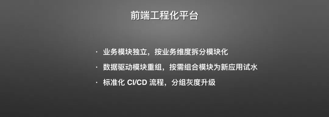 第二点,数据驱动模块重组,我们为什么要让这些模块独立是如何选择的。第三点,我们的研发做好了各个需求,这些需求要如何测试如何上线。当然,一个前端工程化平台不止这三点能力,比如线上的APM、日志监控等等,只是这三点是我认为作为一个作坊到工厂转变必不可少的三点。