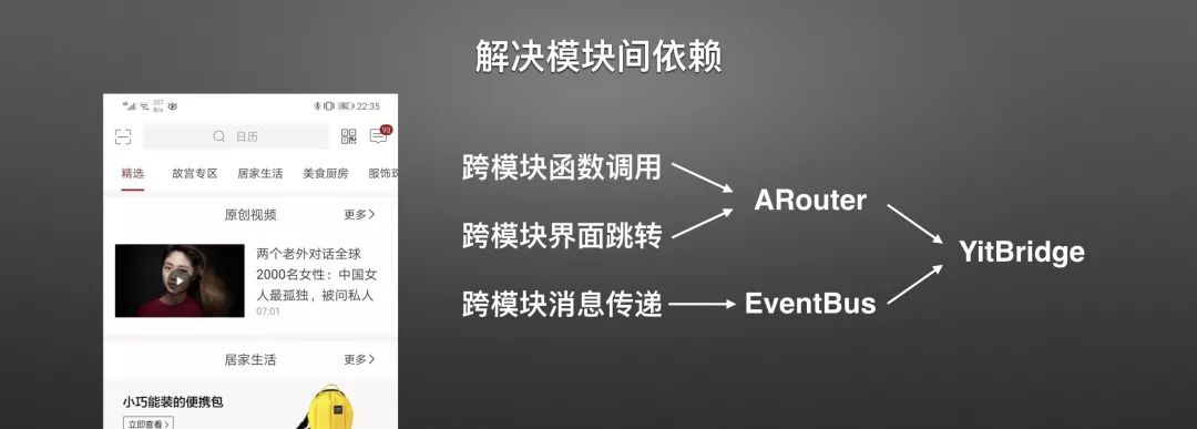 无论任何一个应用,想要做到模块化拆分,都必不可少要面临这三个问题:跨模块函数调用、跨模块界面跳转、跨模块消息传递。 当然,如果这是一个业界常见问题,一定会有开源的解决方案,比如前面两个,我们可以通过阿里开源的ARouter解决,后一个我相信做Android的没有人不知道EventBus。 但是这两个框架在我们真正用起来的时候,都会碰上一些问题。比如ARouter,他从一开始设计就是为了淘宝这样大型的APP去做的,他在应用首次启动的时候要把所有类遍历一遍而这个时间是非常长的,即便是通过分组懒加载也依然很慢。