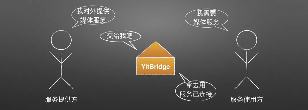 例如图上左边有一个对外提供媒体功能的服务提供者,他告知YitBridge我提供媒体服务:“嘿,老铁,我这有个媒体服务,你那边有谁要用的时候可以用我的。 ”到了另一边,如果此刻有模块说是,我需要媒体服务:“老铁,你那有没有媒体服务,我这边需要播一个铃声啊!”。 “有的,给你。”